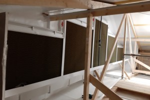 Die warme Luft von außen wird durch das Cool-Pad angesaugt, wodurch Verdunstungskälte entsteht und somit die durch den Stall zirkulierende Luft abgekühlt wird. Cool-Pads sind ideal kombinierbar mit Regenwasserzisternen.